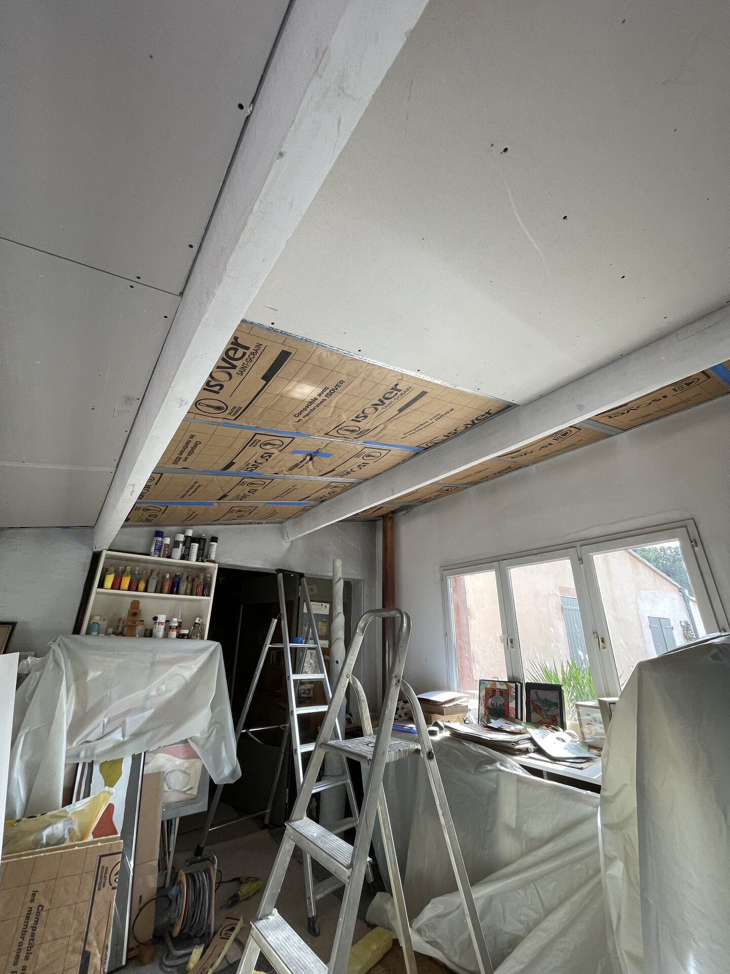 Dans le cadre de l’aménagement d’un atelier d’artiste Home Concept Pro Rénov procède à la mise en place d’une isolation de plafond en laine de verre avec finition en plaques de plâtre constitue une solution performante, à la fois thermique et acoustique. Cette intervention vise à améliorer le confort global de l’espace tout en créant un environnement propice à la création.