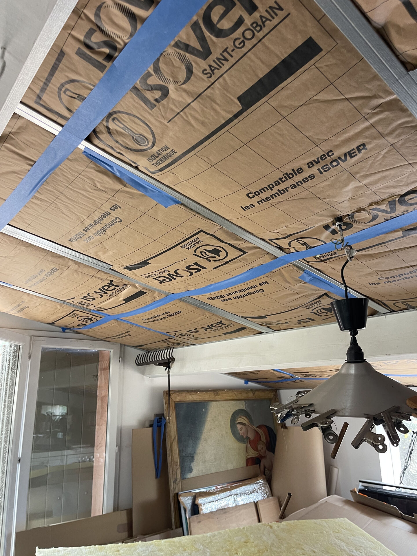 La première étape consiste à préparer le support et à installer une ossature métallique adaptée, solidement fixée au plafond existant. Cette structure garantit la stabilité de l’ensemble et permet l’intégration uniforme de l’isolant. La laine de verre est ensuite disposée avec soin entre les éléments de l’ossature, assurant une couverture continue sans pont thermique. Son rôle est essentiel pour limiter les déperditions de chaleur, réguler la température intérieure et atténuer les nuisances sonores, particulièrement appréciable dans un atelier où l’on recherche calme et concentration.