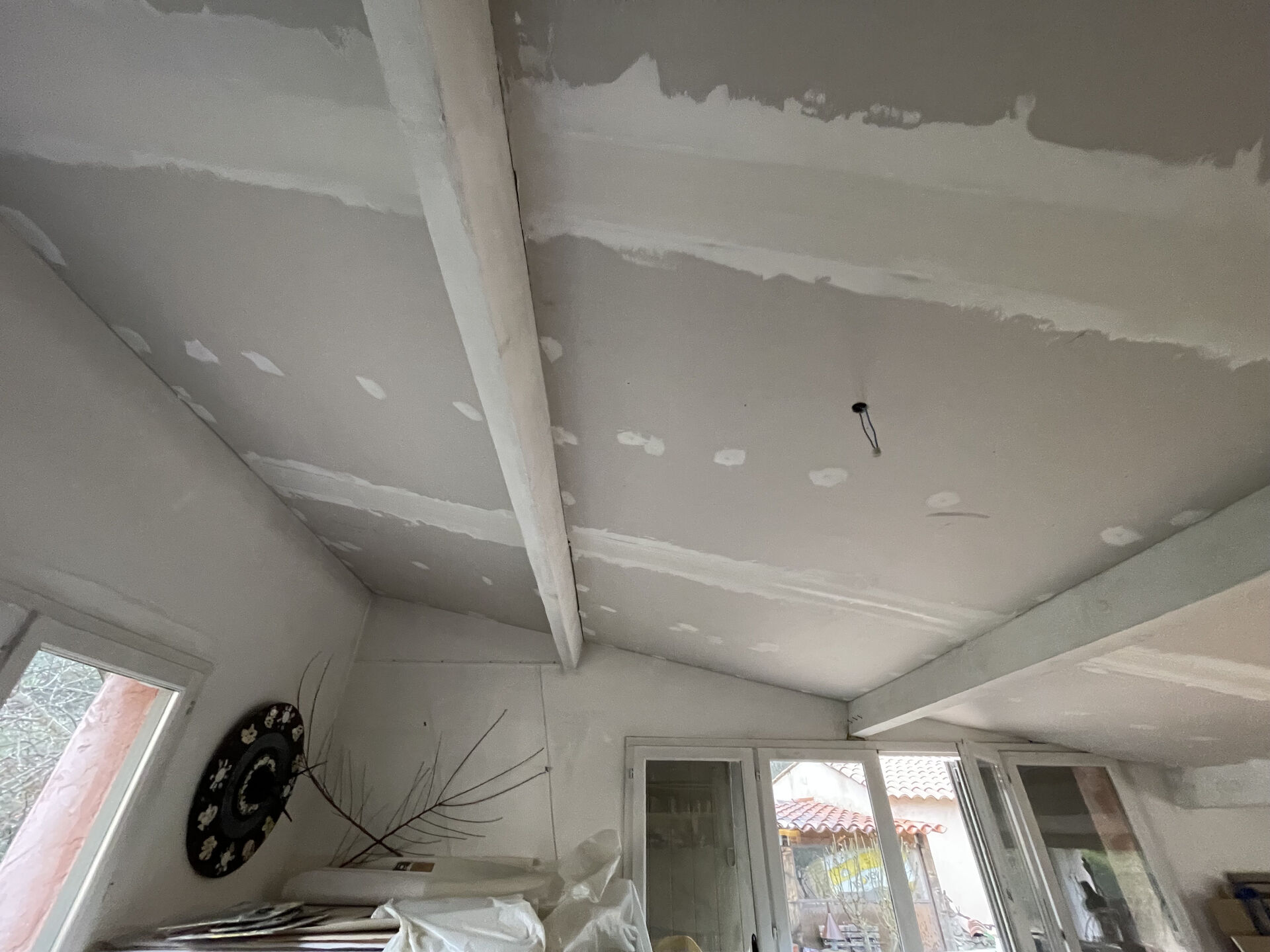 Une fois l’isolation posée, les plaques de plâtre sont fixées sur l’ossature afin de créer une surface plane et durable. Les joints sont traités avec précision pour obtenir une finition soignée, prête à recevoir peinture ou tout autre revêtement décoratif. Ce plafond isolé contribue non seulement au confort thermique de l’atelier, mais participe également à son esthétique en offrant un rendu propre et professionnel.